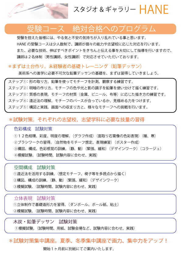 当教室では、美術系高校の受験対策、美術大学、芸大、専門学校への受験対策をおこなっております。