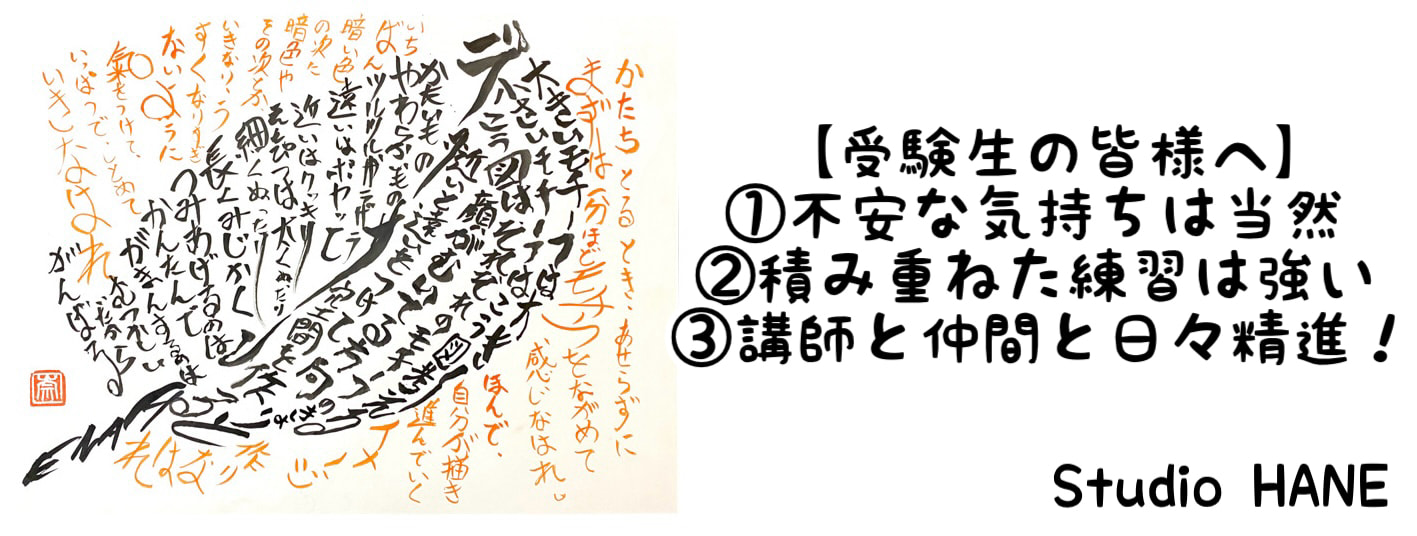 私は1年生からHANE教室で学びました。デッサンが特に自信が無かったのですが、3年生になってからコツが掴めるようになり、先生方の助言と、自分の「表現する」が合致した感覚を覚えています。きっと先生方は全力でサポートしてくださるので、悩みも全て伝えてください!