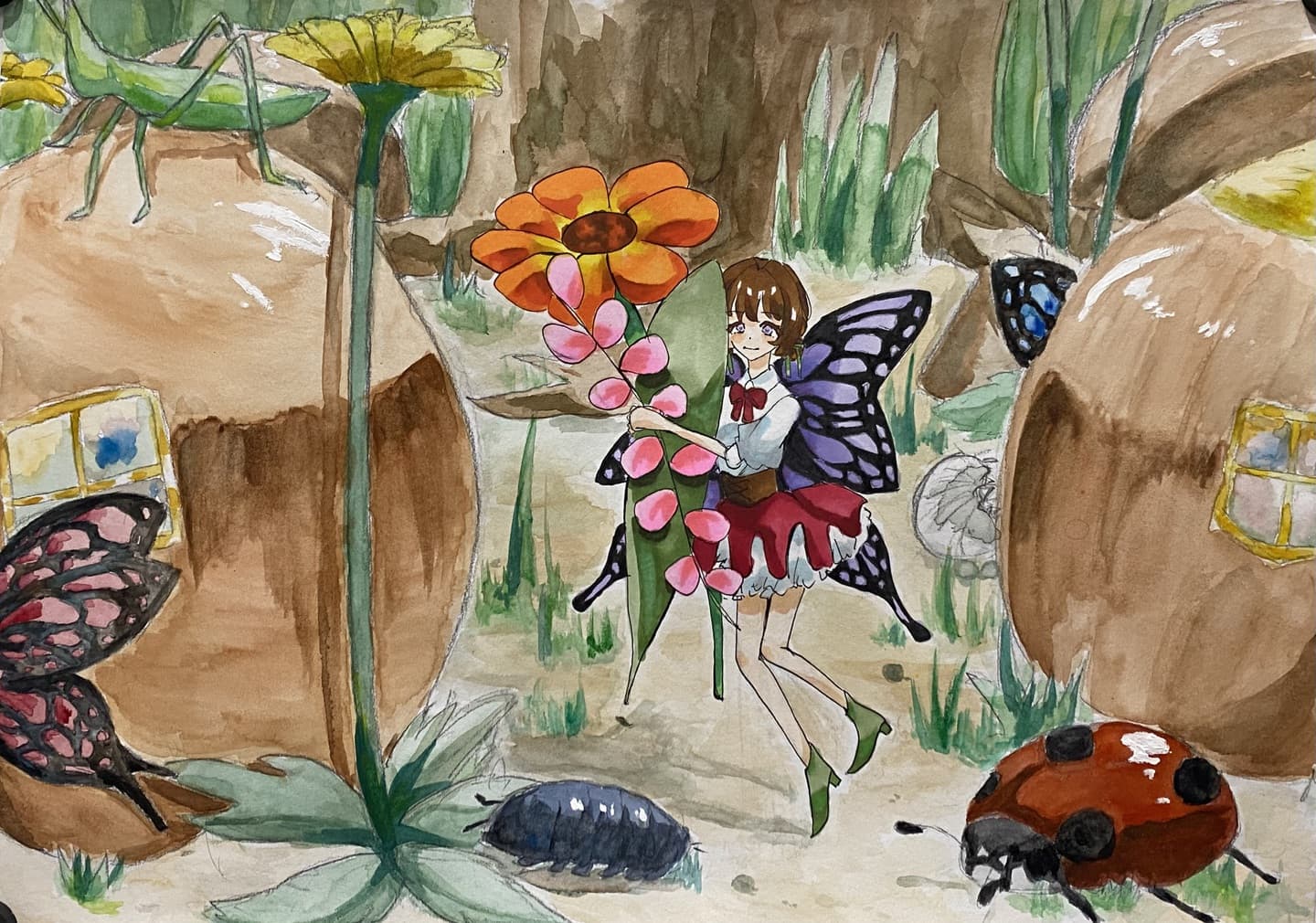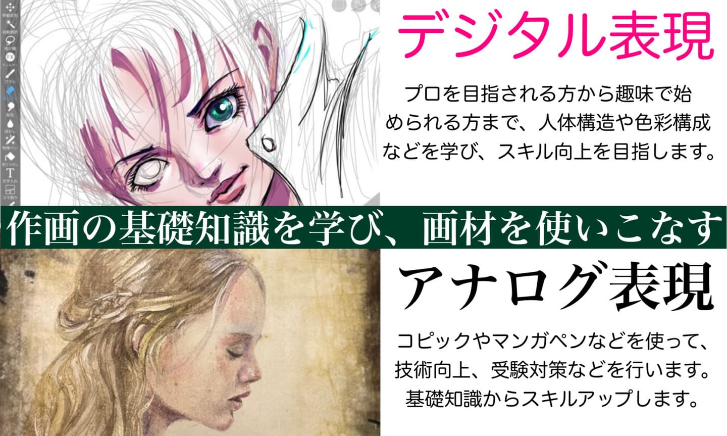 コンクール出品作品のほとんどは自由表現です。デッサンの授業とは違い、心のままに描いていただきます。講師陣は本人が行いたい表現を画面に表せるかのお手伝いを行います。