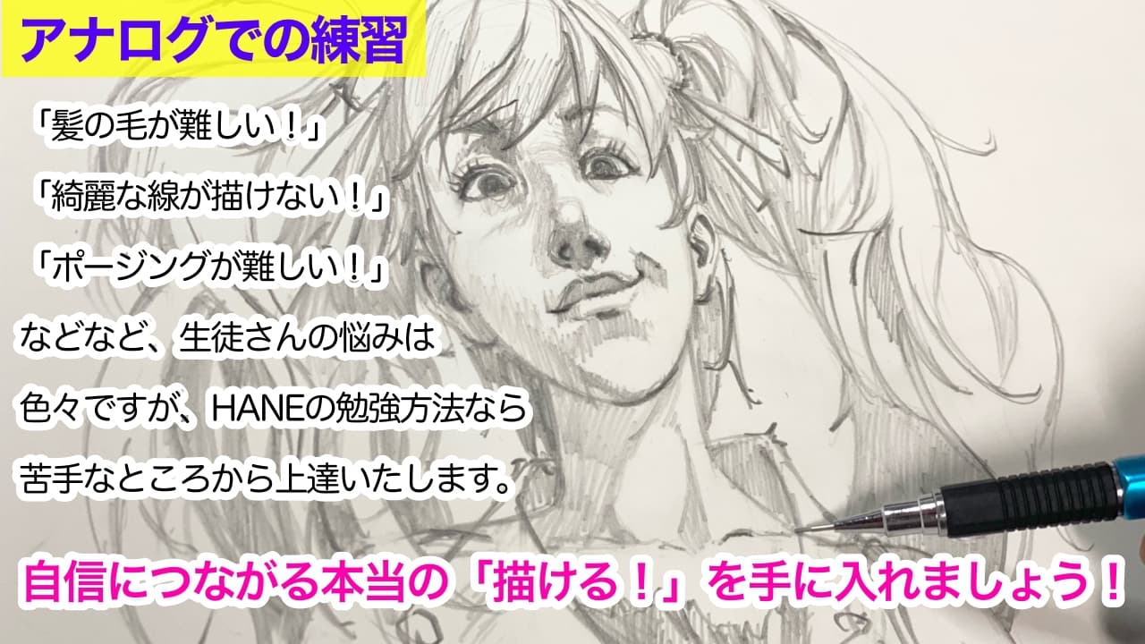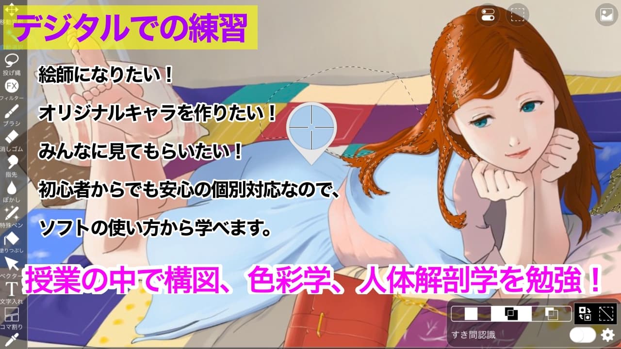 本校ではアナログ、デジタルの両方を指導しております。アナログは手描きでしかない魅力を、デジタルでは、デジタルでしかできない表現を鍛えていきます。(デジタルご希望の場合、iPadのご持参お願いいたします)また、デッサン力が必要となってくる場合はデッサンも指導行っております。